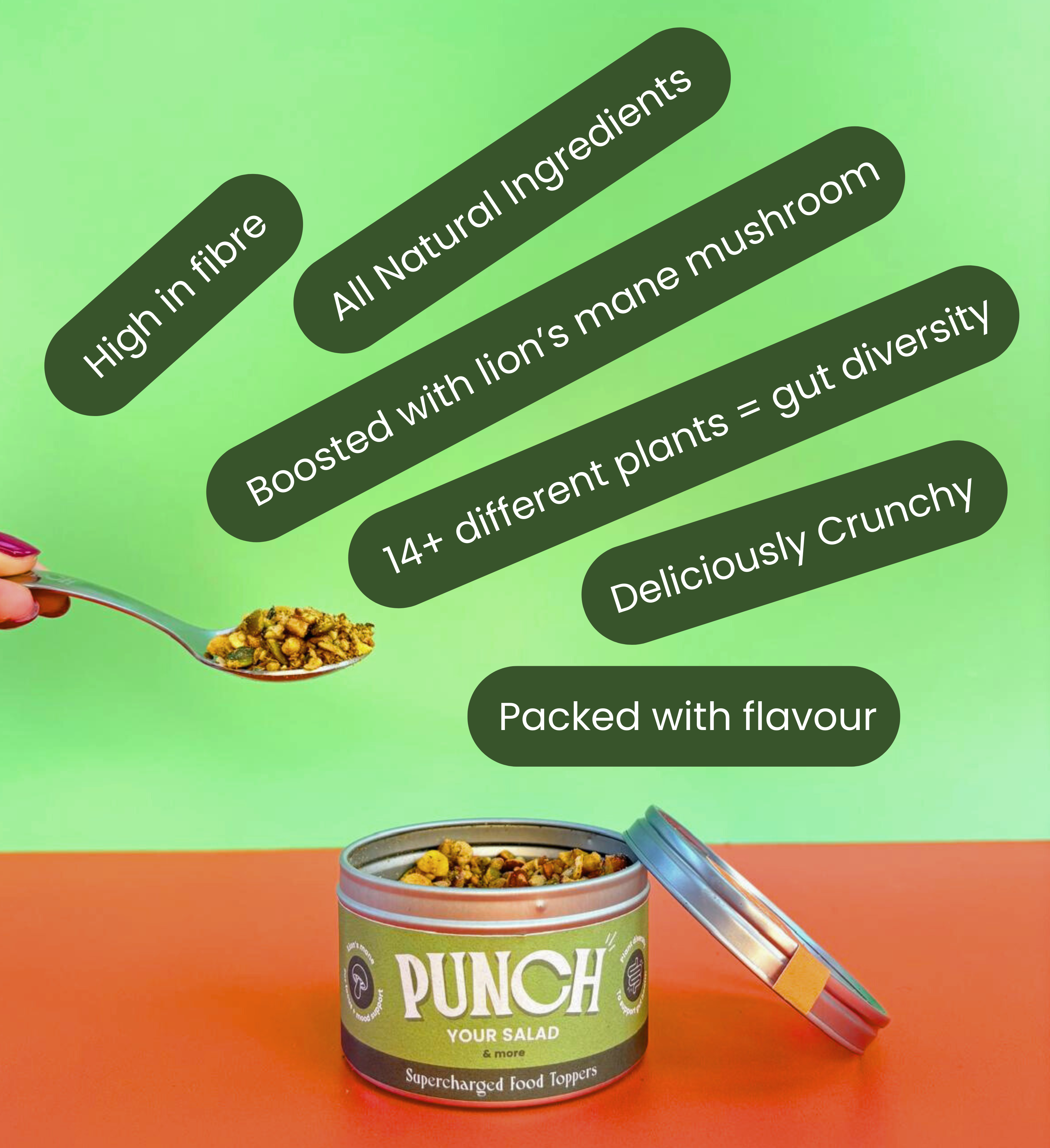 A delicious range of chef-crafted food toppers; full of nuts, seeds, spices & superfoods, boosted with lion's mane, and designed to sprinkle over every meal. PUNCH is healthy eating, made easy.