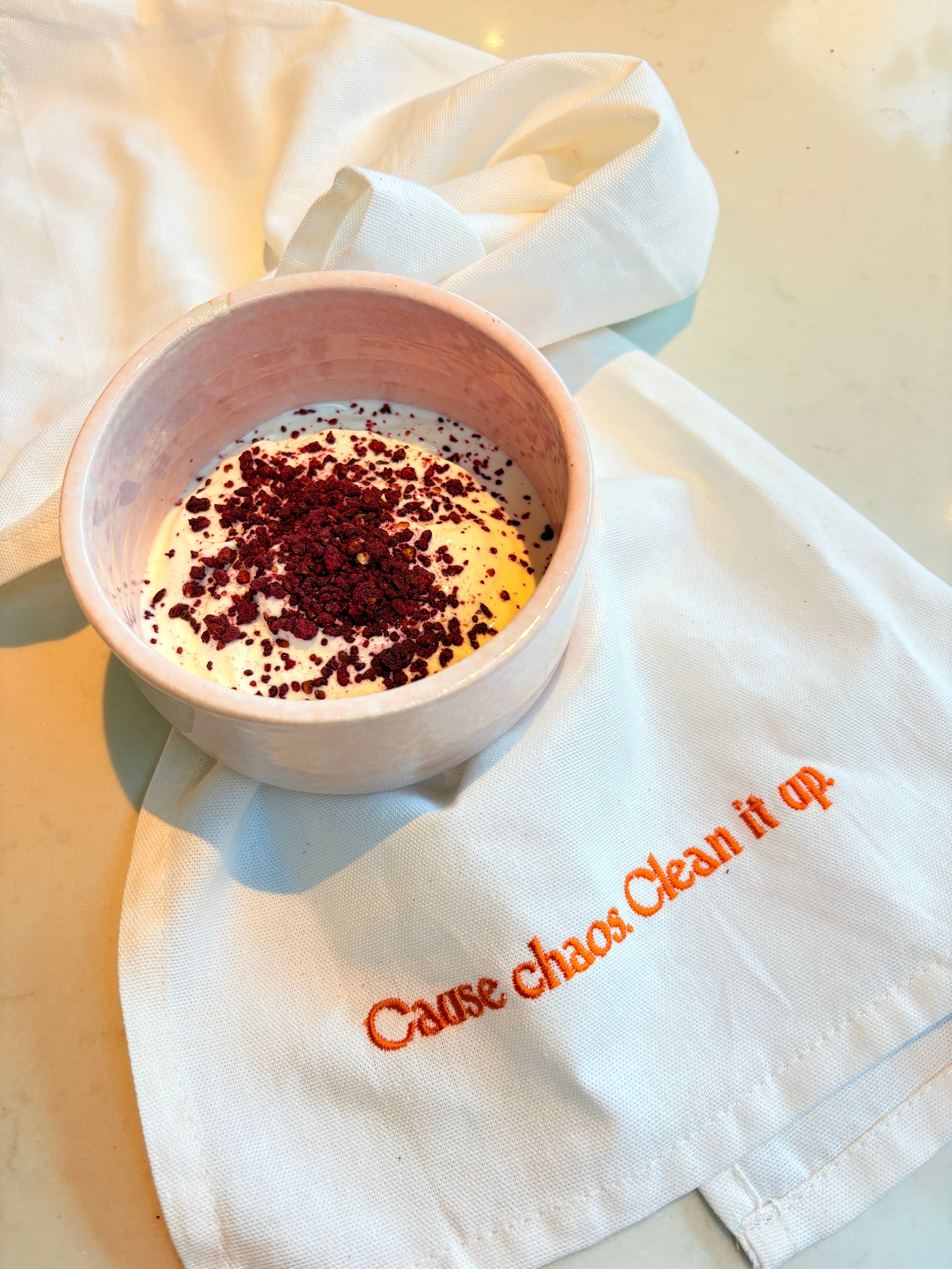 Our PUNCH tea towel is here for every extra-enthusiastic cook, chaotic brunch-maker and over-zealous sprinkler. Chuck the seeds, drop the oats, spill the milk (don't cry). This is your licence to PUNCH wildly and clean stylishly. Celebrating the joyful chaos of good food whilst being soft, durable and designed to actually look good hanging in your kitchen (it's even got a handy corner tab for this exact purpose!)