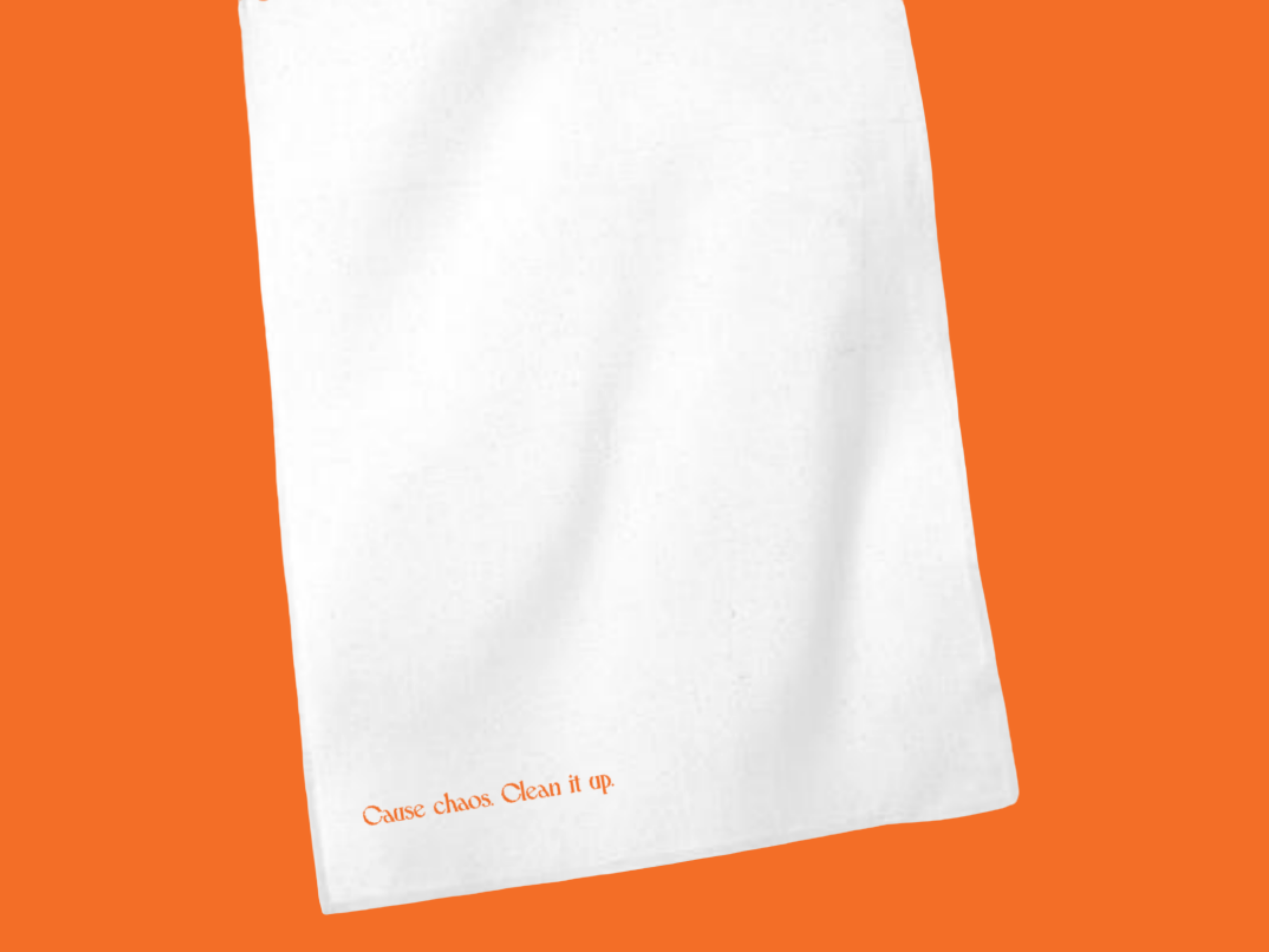 100% (white) cotton plus our signature motto (in orange): "Cause chaos. Clean it up."