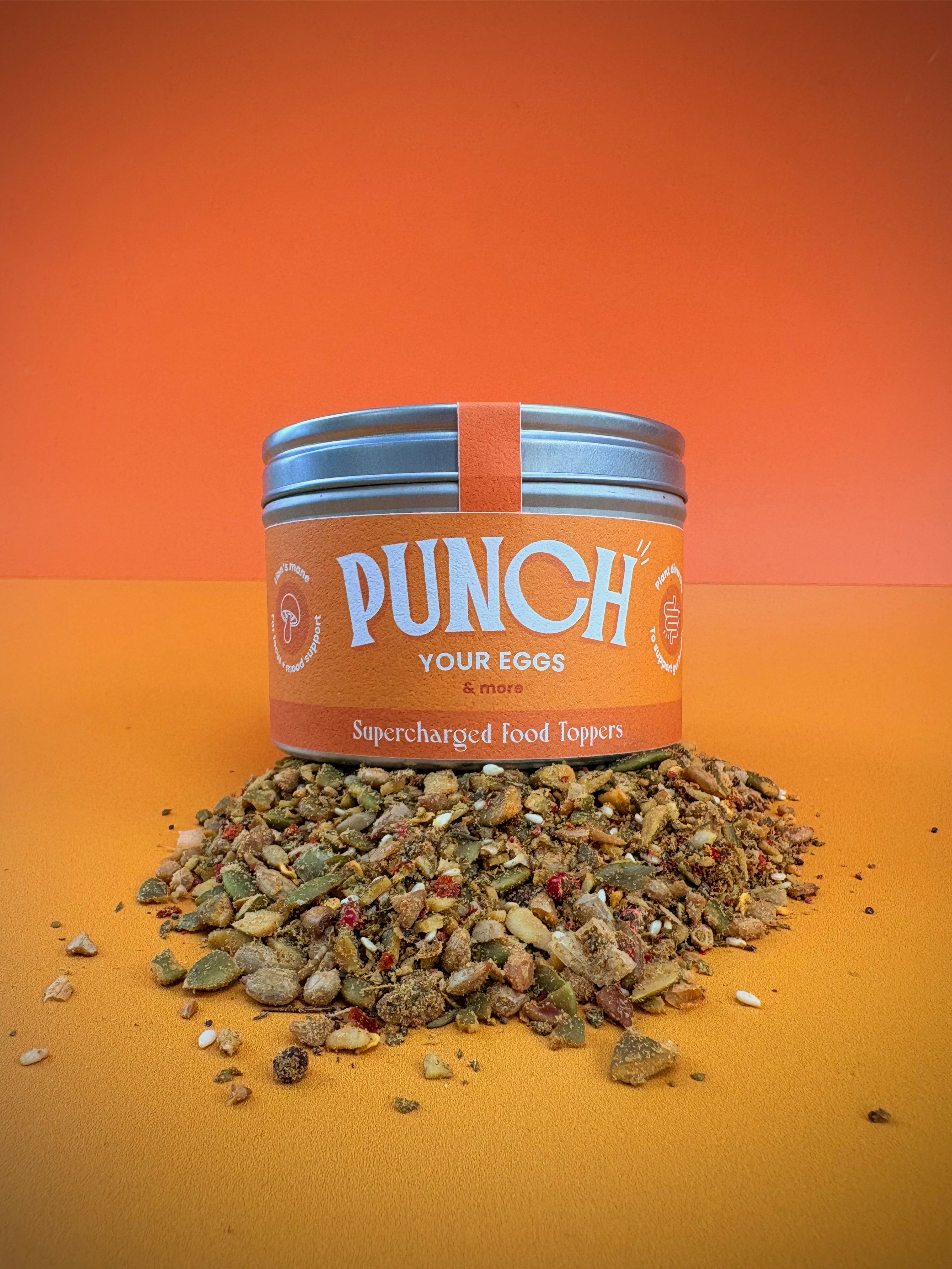 Punch your Eggs Ingredients (allergens in bold): pumpkin seeds, sunflower seeds, organic lions mane (100% fruiting body), olive oil, sesame seeds, pink peppercorns, chilli flakes, sea salt, poppy seeds, cumin, basil, oregano, marjoram, thyme.